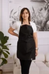 Klasyczny fason kosmetycznego fartuszka delikatnie przylega do ciała, podkreślając sylwetkę i optycznie ją wysmuklając. Ten model doskonale przełamuje stonowaną stylizację do pracy, zapewniając komfort noszenia i poczucie estetyki przez cały dzień.
