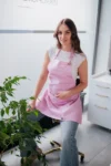 Fartuszek ochronny o klasycznym kroju w gładkim, różowym kolorze to połączenie funkcjonalności i stylu. Wyposażony w praktyczną kieszeń z przodu oraz eleganckie złote dodatki – kółka, karabińczyki i regulatory – prezentuje się nowocześnie i kobieco.