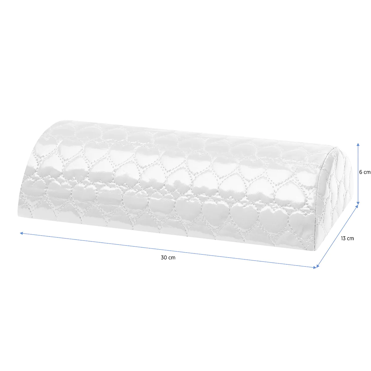 Poduszka została wyposażona w elegancki pokrowiec w odcieniach bieli, wykonany z błyszczącego materiału syntetycznego, który jest odporny na wilgoć i nie zatrzymuje zabrudzeń. Pikowane serca na powierzchni pokrowca dodają mu stylowego charakteru. Materiał nie przyciąga pyłu z piłowanych paznokci, a jego czyszczenie jest wyjątkowo proste – wystarczy przetrzeć pokrowiec wilgotną szmatką lub gąbką. Pokrowiec zapinany na zamek błyskawiczny umożliwia łatwą wymianę lub dokładniejsze czyszczenie.
