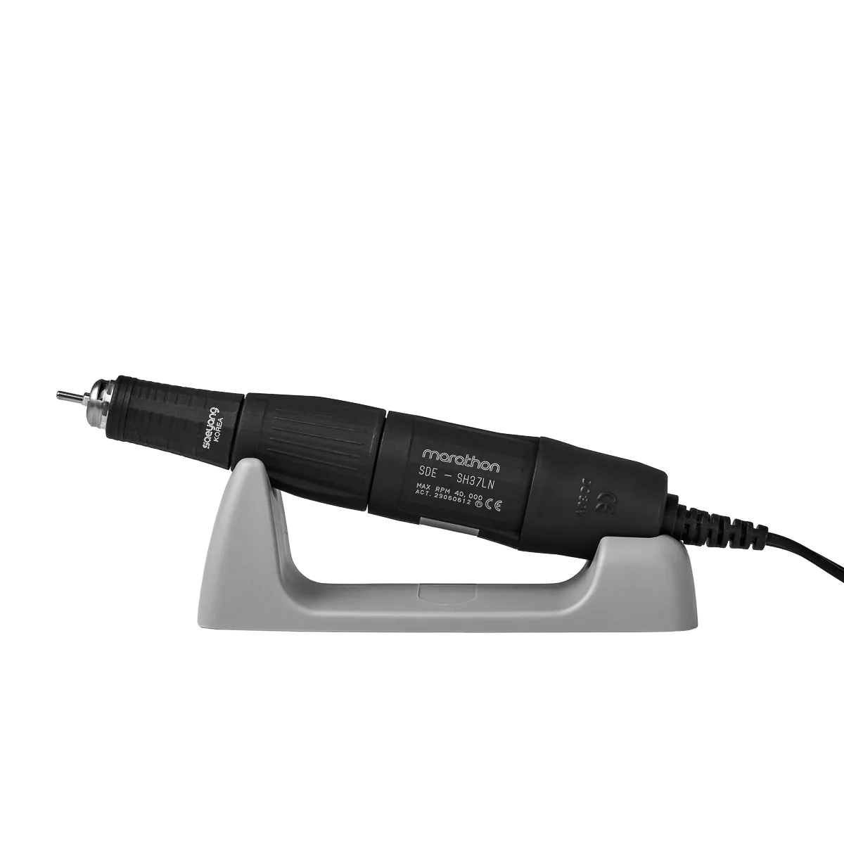 Głowica SH37LN zapewnia wysoki komfort pracy, doskonale leży w ręce i osiąga prędkość 40 000 obrotów na minutę, co znacznie ułatwia wykonywanie zabiegów. Dzięki systemowi Twist-Lock, wymiana frezów jest szybka i intuicyjna. Pióro frezarki jest ergonomicznie zaprojektowane, a jego wibracje zostały zminimalizowane, co umożliwia komfortową pracę nawet przez długie godziny. Obudowa z tworzywa sztucznego efektywnie ogranicza przepływ ciepła, a elastyczny kabel sprężynka o długości do 135 cm zapewnia wygodę użytkowania.